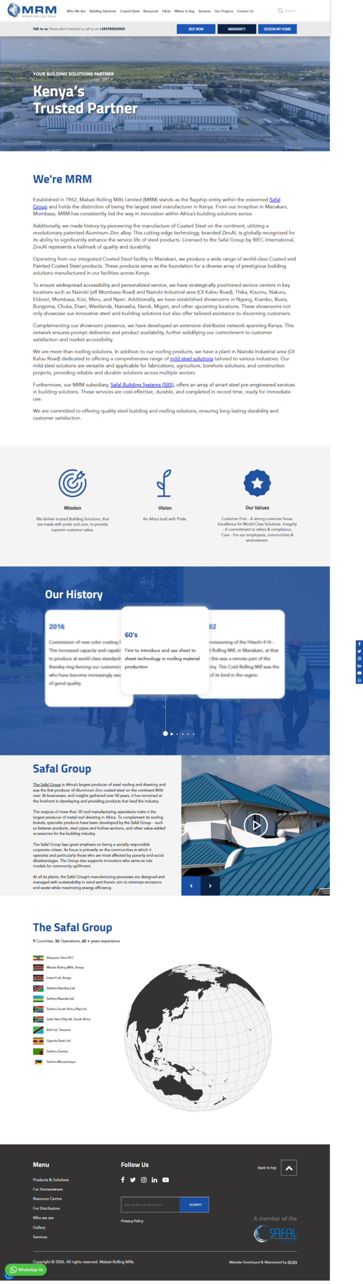 Mabati Rolling Mills Limited(MRM) is the largest company withing the Safal Group, and was its founding operation, commencing in 1962 at Mariakani, near Mombasa Kenya. The Safal Group is Africa’s largest supplier of Building solutions that offer superior quality and lasting value. Businesses in Eastern and Southern Africa supply a diverse range of markets and customers with brands that are trusted to perform and are market leader in their field.